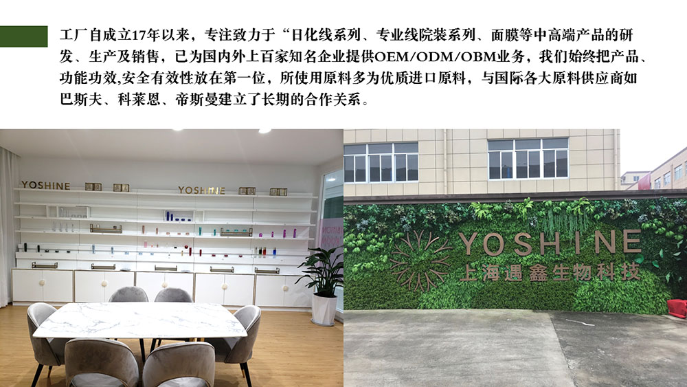 上海遇鑫生物科技有限公司是专业生产国内外高端护肤、洗涤类的化妆品加工OEM/ODM专业供应商,专业从事化妆品加工生产研发15年。上海遇鑫千亿体育官方网站占地30亩,建筑面积30000多平方米,员工300-500多人。拥有10万级净化车间以及30万级包装车间,18条自动流水线。生产车间完全按照GMPC国际标准设计建造,通过ISO9001、ISO14001、GMPC、欧盟ISO22716(GMP)等多项国际认证,属于全球美妆基地上海东方美谷104工业板块,并拥有一流通风净化系统。研发团队有国外一流的韩国化妆品研发专家和国内资深十多年开发经验的工程师参与研制配方及开发产品。可以自主研发国内外各种高端护肤洗涤类等高新化妆品项目,原料供应商分布国内外,包括瑞士,日本,韩国,美国,德国,法国等原产地的顶级原料商。公司有花园式工厂、现代化生产链、人性化管理模式,及学习型组织使每一位遇鑫员工活力四射、朝气蓬勃。