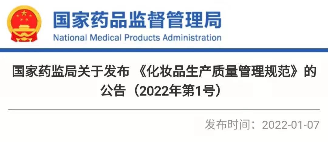 今日(1月7日),国家药监局官网发布一则关于 《化妆品生产质量管理规范》的公告(2022年第1号)(以下简称《规范》),这是国家药监局在两度征求社会各界意见后,正式发布的文件。《规范》将于2022年7月1日起施行。